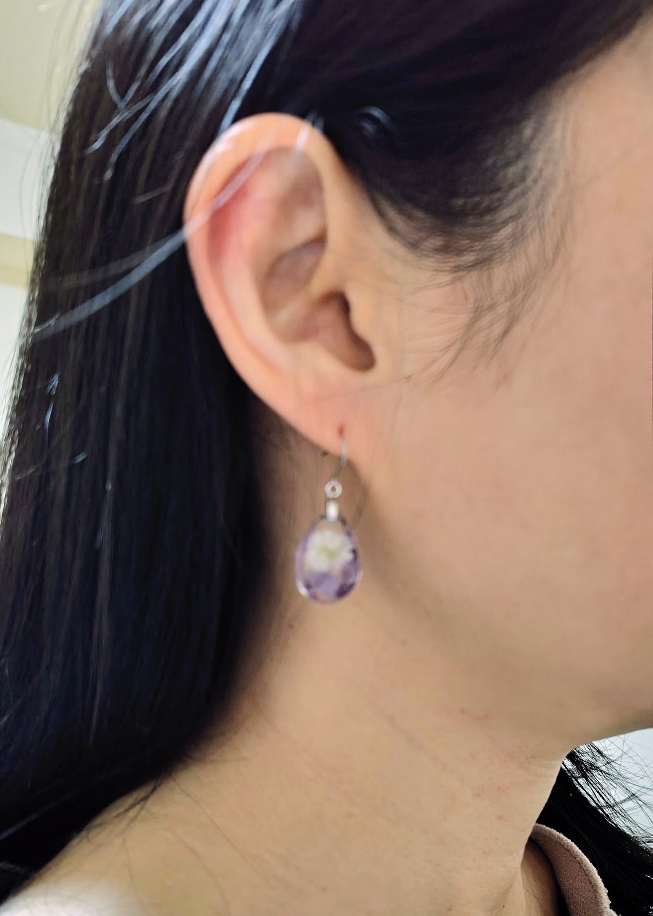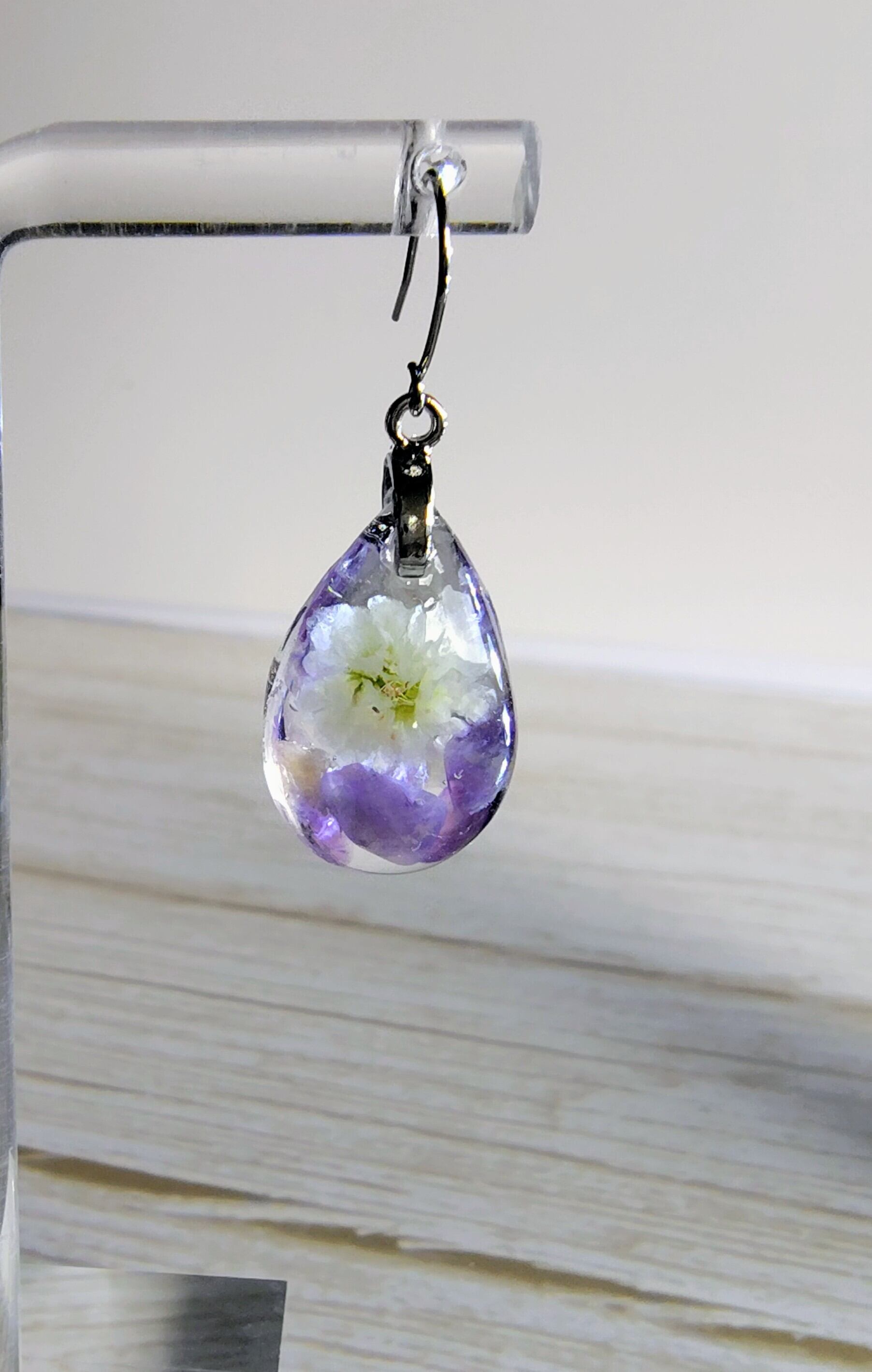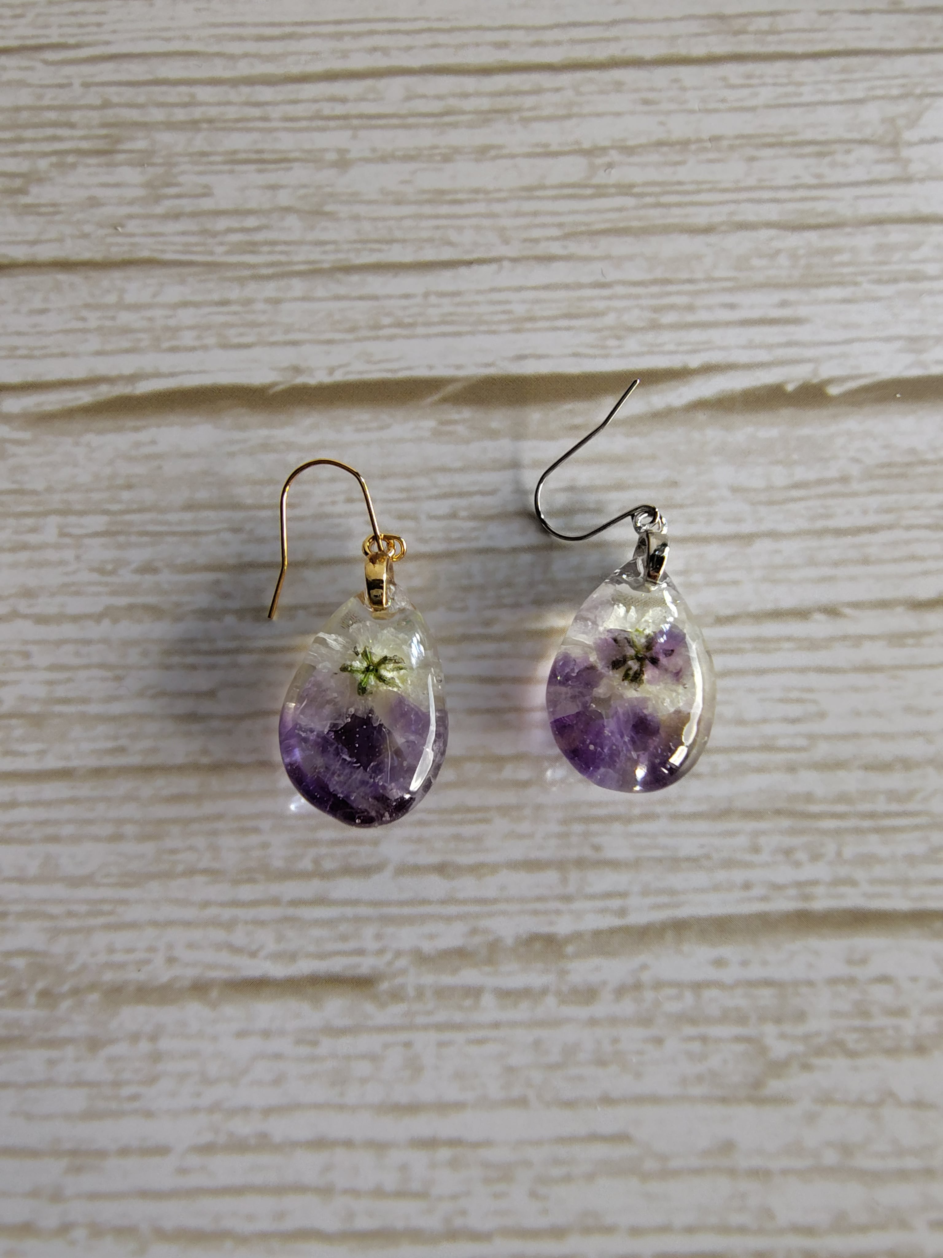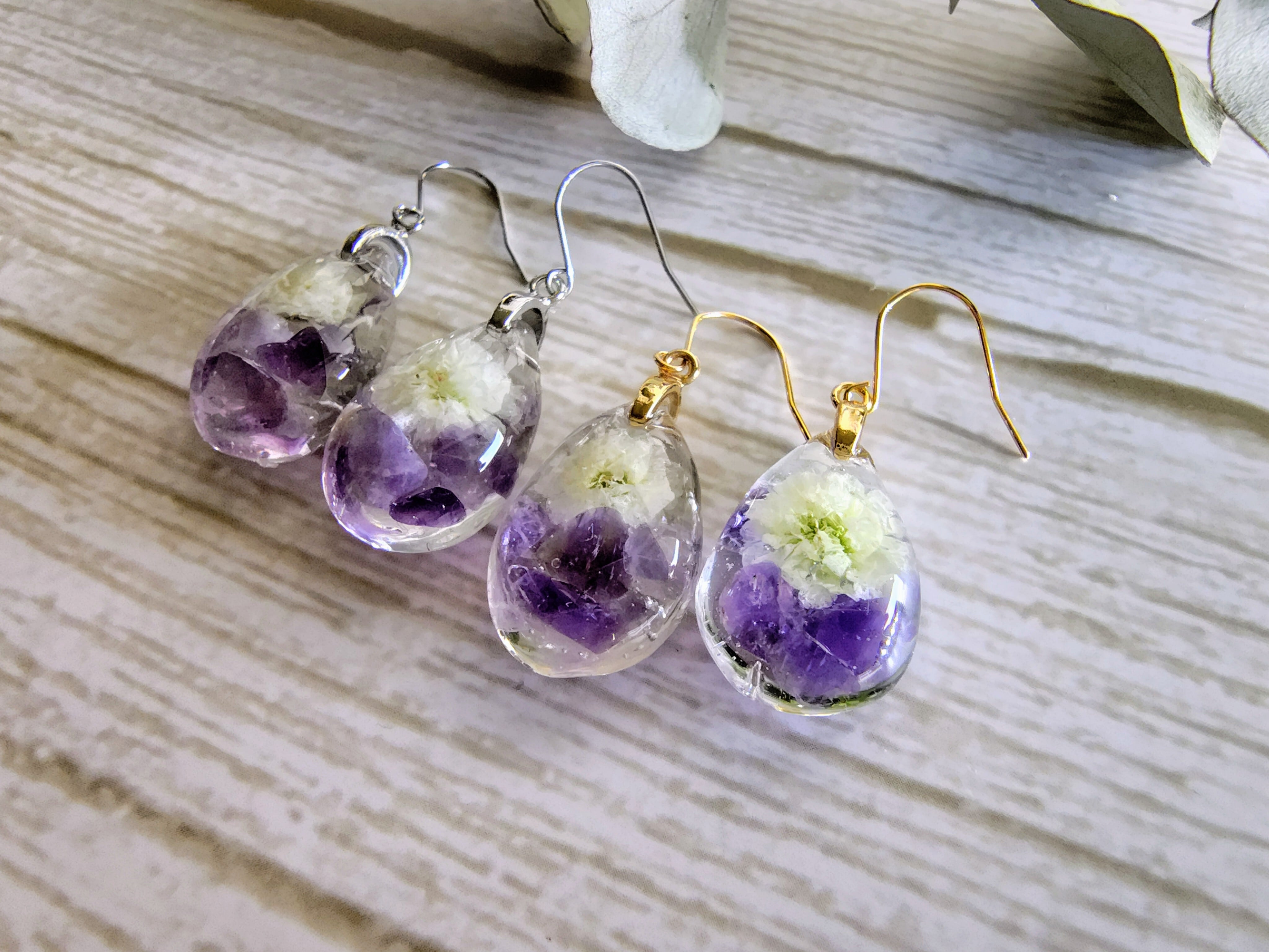 アメジストとかすみそうのドライフラワーをレジンで閉じ込めたピアスです。
